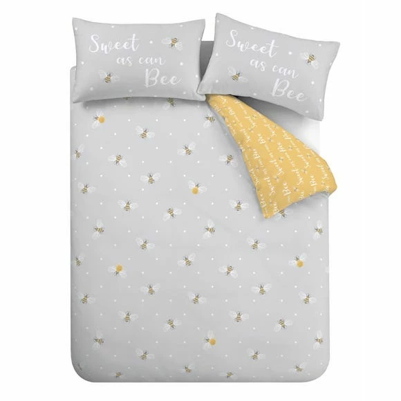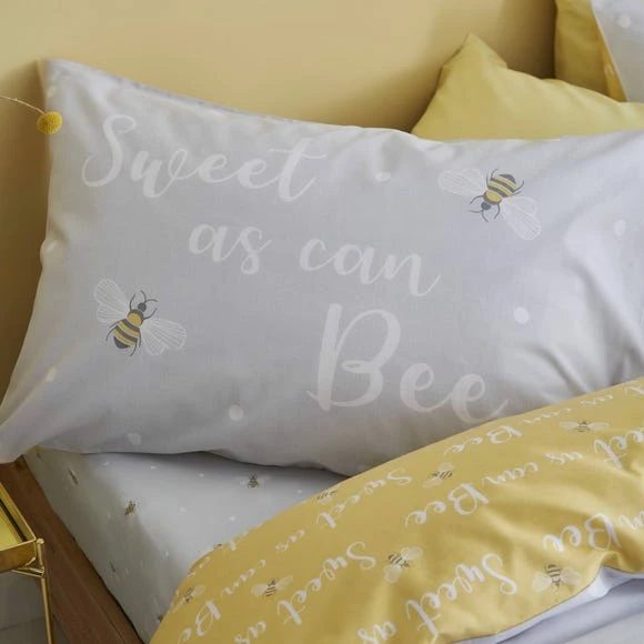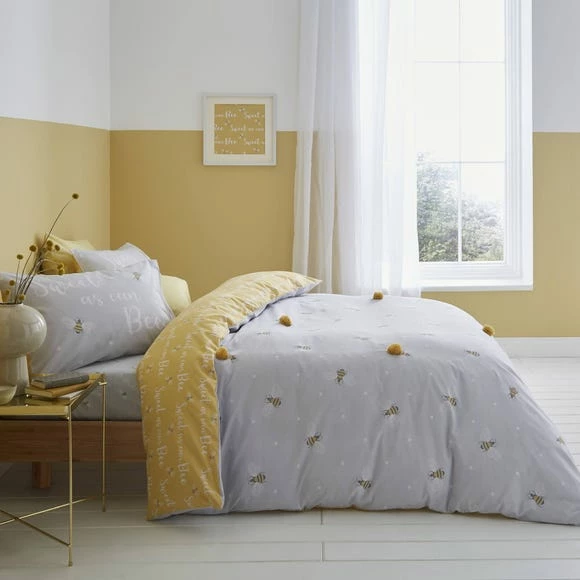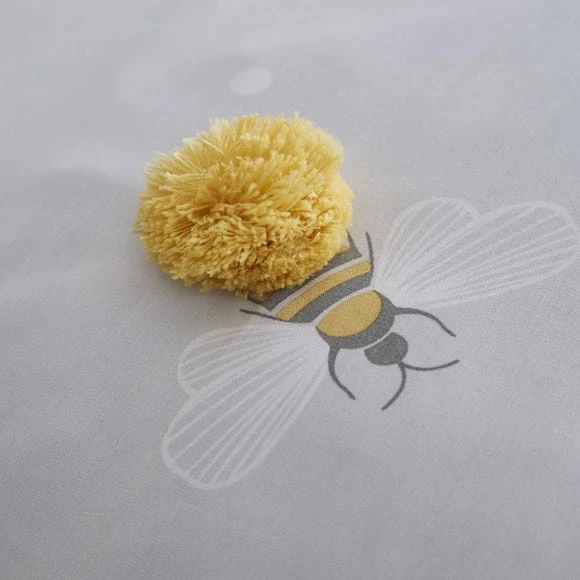 As sweet as can bee! This playful motif bedding features buzzing bees, on-trend polka dots, and fluffy pom pom detailing with a contrasting bright text reverse for easy, alternative bedroom styling. This duvet set features a button fastening to help secure the cover around the duvet and side labels.