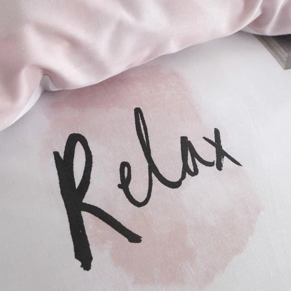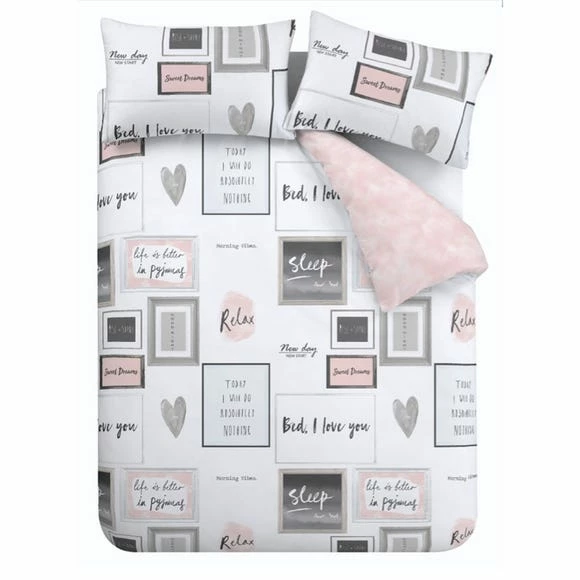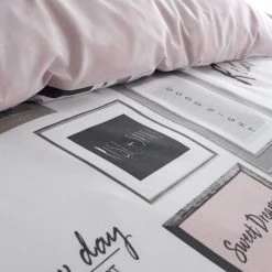 Relax in a contemporary soft blush pink & grey palette with this duvet cover and pillowcase set. Boasting a feel good print that features fun, cute on trend quotes, this set turns your bedroom into a happy zone with positive vibes! Turnover to a soft blush pink reverse – when nothing but pink will do! This set is available in a range of sizes.