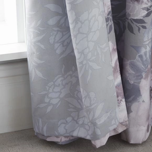 In an impressionist painterly style, these delicate grey and pink Japanese blossom curtains with floral print lining adds a dramatic botanical style to your windows. Designed by Catherine Lansfield, these curtains have a dyed to match lining and is finished with a ring top header that is suitable for curtain poles (4cm diameter eyelets). Ethically sourced overseas and made to strict quality and human-ecological safety standards, in accordance with STANDARD 100 by OEKO-TEX®, they are made from 100% cotton front with a 80% polyester 20% cotton lining.