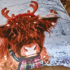 Our winter highland cow is ready for a very Happy Christmoo. This design is set on a winter background, featuring fun, novelty antlers and a robin friend. Paired with a cosy tartan check reverse for the ultimate winter feel this Christmas this set is finished with a button fastening. Ethically sourced overseas and made to quality and human-ecological safety standards, in accordance with STANDARD 100 by OEKO-TEX®, it is made from soft and comfortable easy care 52% Polyester 48% Cotton fabric, requires minimal ironing.