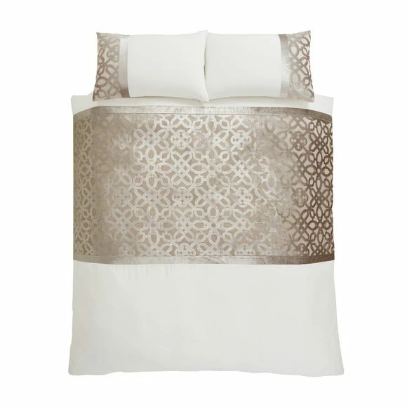 Beautifully textural and soft to touch, this duvet cover and pillowcase set will not only add comfort to your bedroom but will add a touch of class too. The lattice detail on the devore velvet panel is perfect for creating a luxurious but relaxed bedroom. This duvet cover and pillowcase set is available in a range of sizes and other matching bedroom accessories and bedding is available.