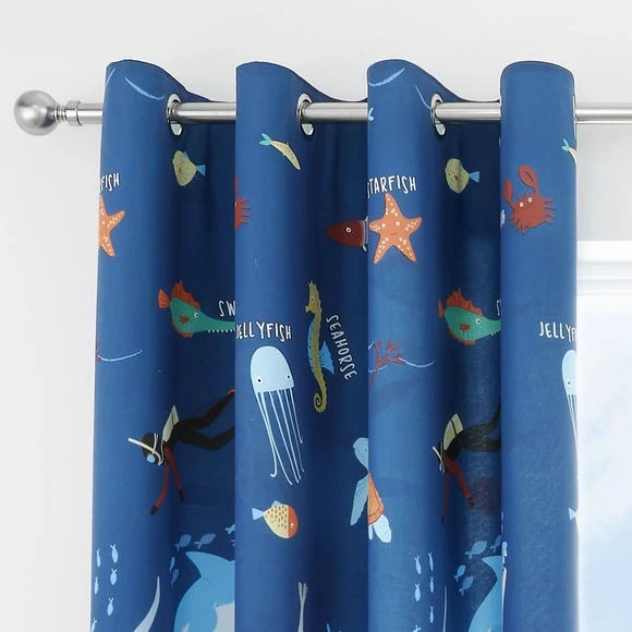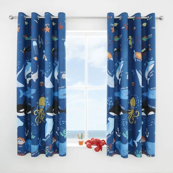 Explore the depths of the deep blue sea with your underwater friends. This design features a range of cartoon like sea life including; orca whales, hammerhead sharks, octopuses and turtles. This educational curtain, paired with a fish print lining will make bedtime super fun. These fully lined curtains are finished with a ring top header that is suitable for curtain poles and are made to strict quality and human-ecological safety standards, in accordance with STANDARD 100 by OEKO-TEX®. Made from 52% Polyester 48% Cotton, they should be dry cleaned only.