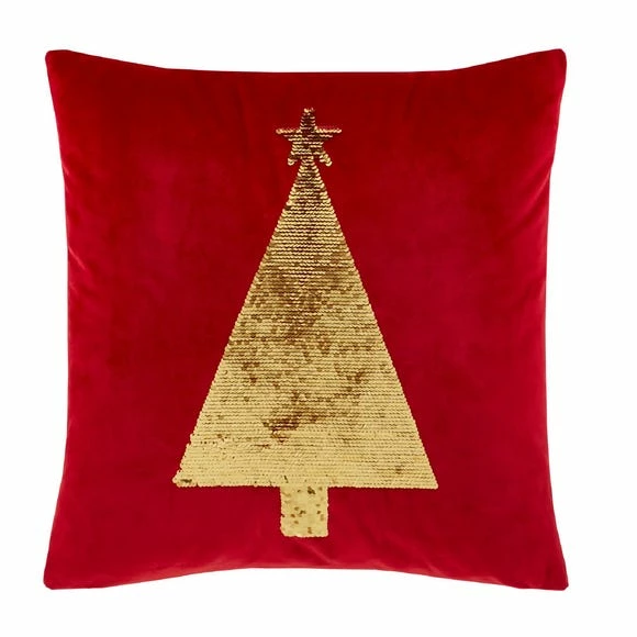 Add some festive sparkle with this red cushion which features a reversible gold sequin Christmas tree.