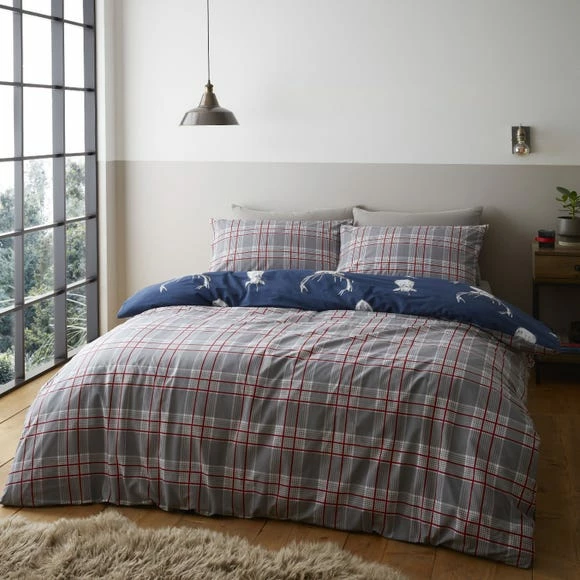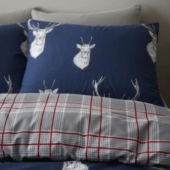 Ideal for cold and wintery nights, this stylish navy duvet cover set can add a touch of cosy sophistication to your bedroom with a brave stag print and a reversible contrasting check design to offer a fresh and alternative look.