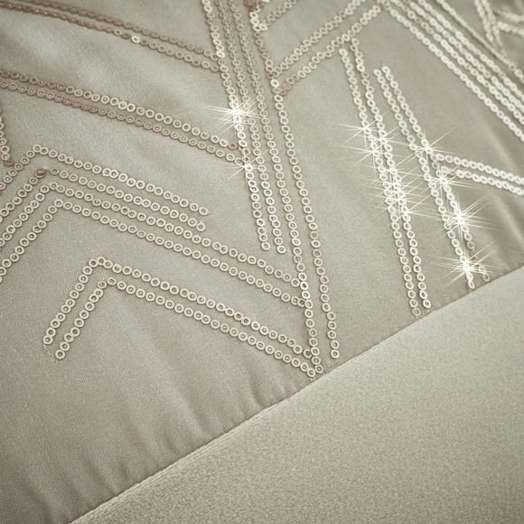 Art Deco inspired, shimmering panels of sparkling sequins decorate this soft velvet touch duvet cover set in a glamorous and elegant champagne colour, making it ideal for adding an elegant touch to your bedroom. Catherine Lansfield is renowned for style and quality – designed and developed in Great Britain. Made from 100% polyester front with a 50% cotton 50% polyester reverse, this bedding set is soft, durable, and machine washable. This bedding is ethically sourced overseas and made to strict quality and human-ecological safety standards.